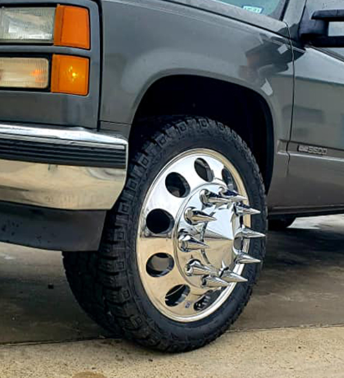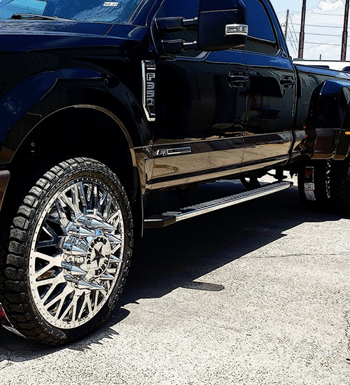 Our Dually wheel set up are with adapters in any dually truck. From Square body duallies that have drops, we can tuck in those wheels to 24’s wrapped with aggressive tires.